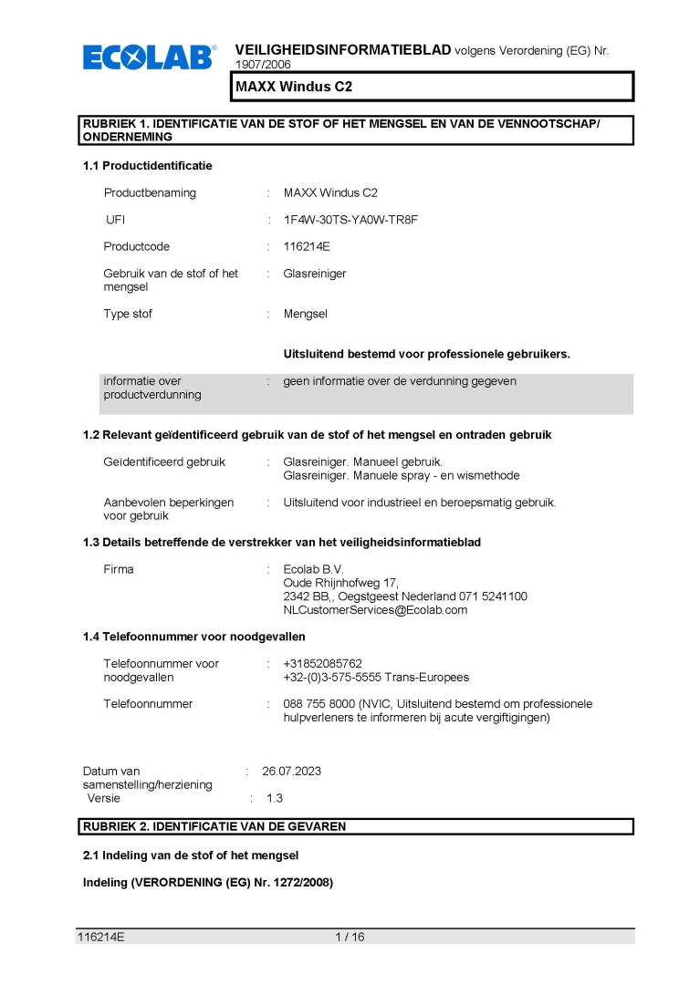 Veiligheidsinformatieblad ECOLAB Glas- en interieurreiniger MAXX Windus C2 750ml.