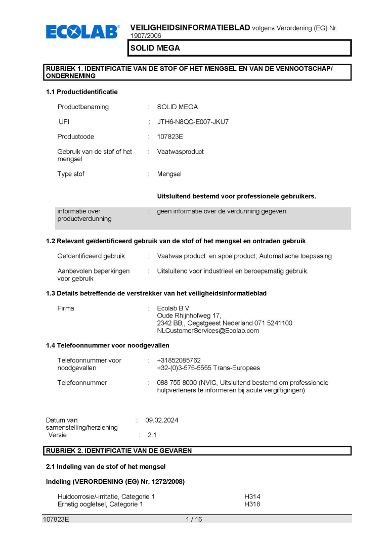 Veiligheidsinformatieblad ECOLAB Vaatwasmiddel Solid Mega 4,5kg.
