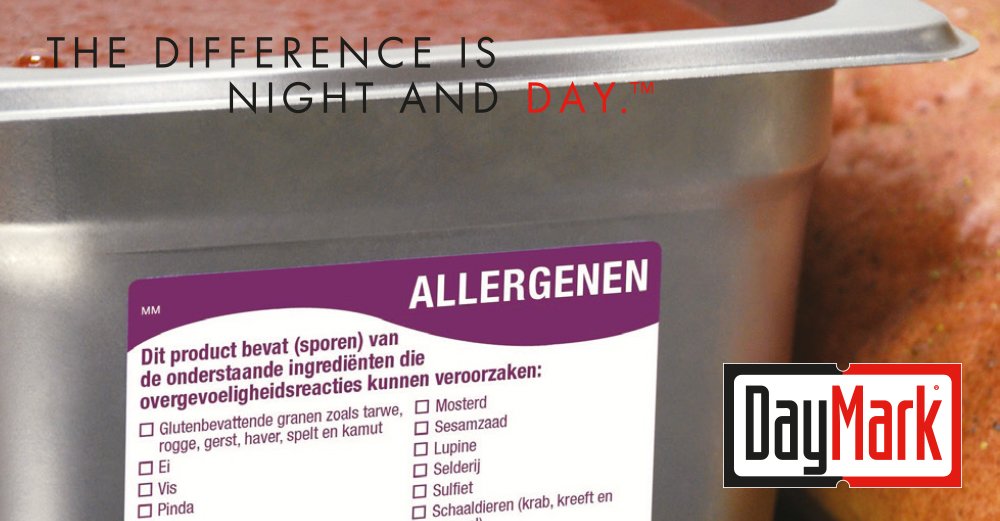 Het gaat om een makkelijk verwijderbare sticker die desgewenst hergebruikt kan worden. Tevens biedt DayMark™ een universele sticker waarop alle 14 allergenen vermeld staan. Door eenvoudig aan te vinken welke allergeen in het voedsel zit, is deze sticker multifunctioneel inzetbaar! De 14 individuele allergenen worden tevens aangeboden in plastic dispenser, Per dispenser 7 rollen met 7 verschillende allergenen à 1000 stuks.