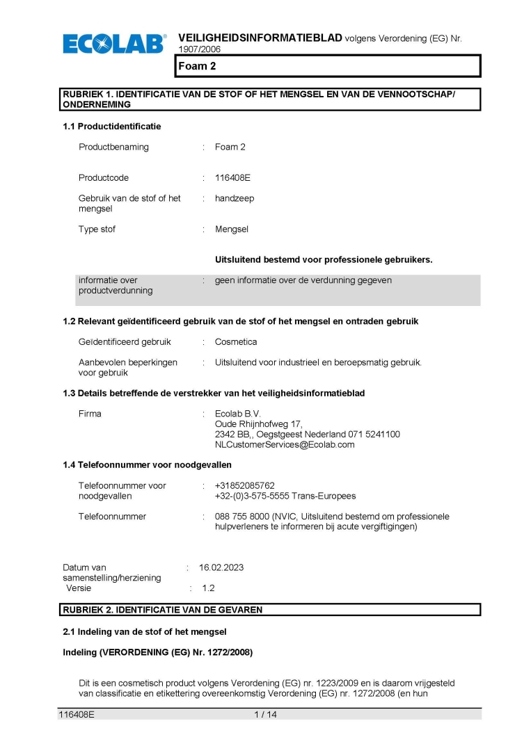 Veiligheidsinformatieblad ECOLAB Foam 2 750ml